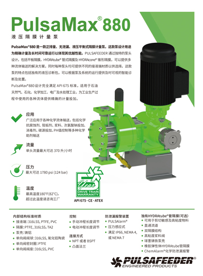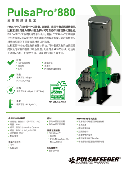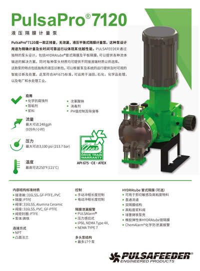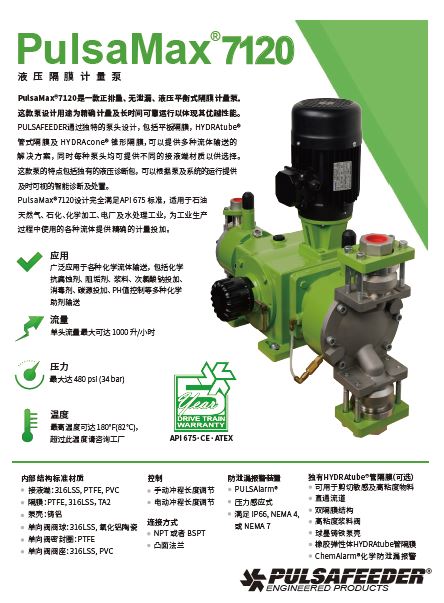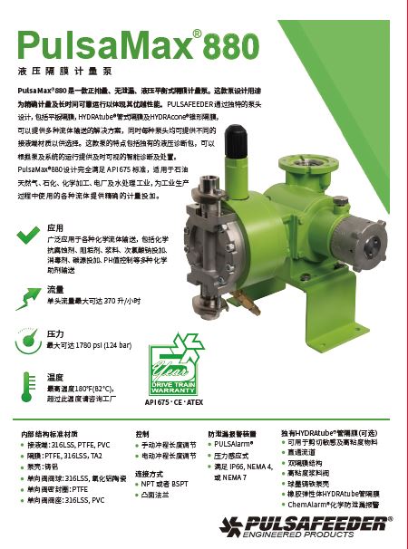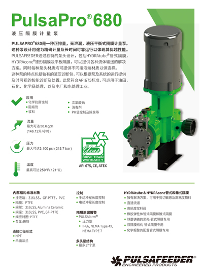 帕斯菲达公司成立于20世纪40年代初期。PULSAFEEDER EPO工厂拥有雄厚的技术力量和丰富的现场处理经验,产品性能优异。所有液压隔膜计量泵完全按照API675标准设计制造,也可以按用户制定的标准制造。帕斯菲达计量泵产品广泛应用于石化,化工,电厂的化学加药,市政水处理及废水处理等诸多领域。主要产品包括:Pulsafeeder 隔膜计量泵, Pulsa GLM系列机械隔膜计量泵,Eclipse 齿轮泵 , ECO和Isochem齿轮泵。